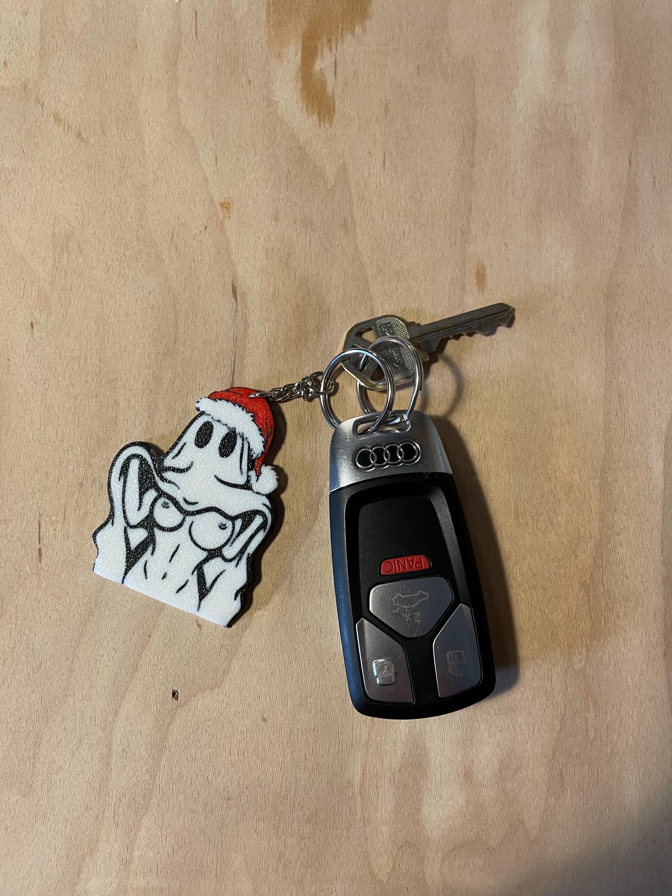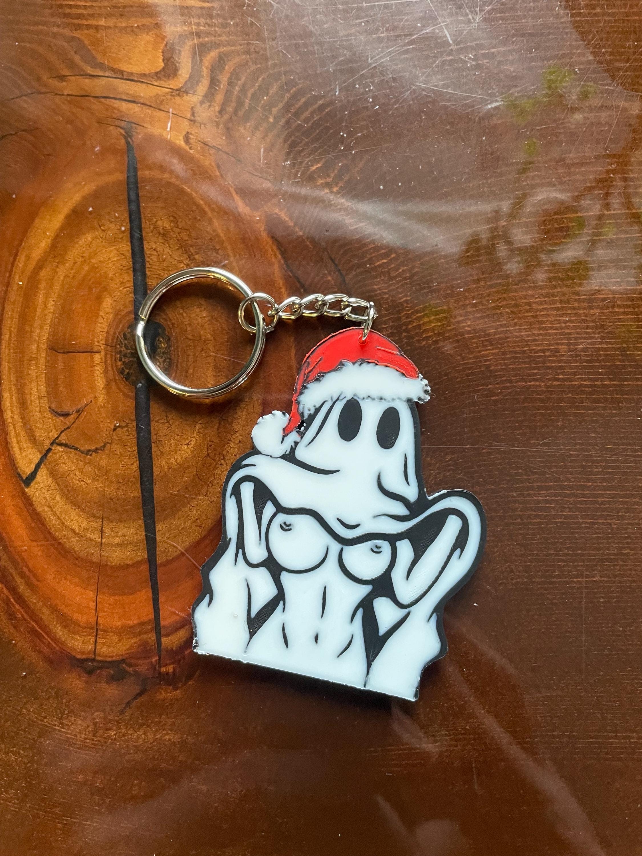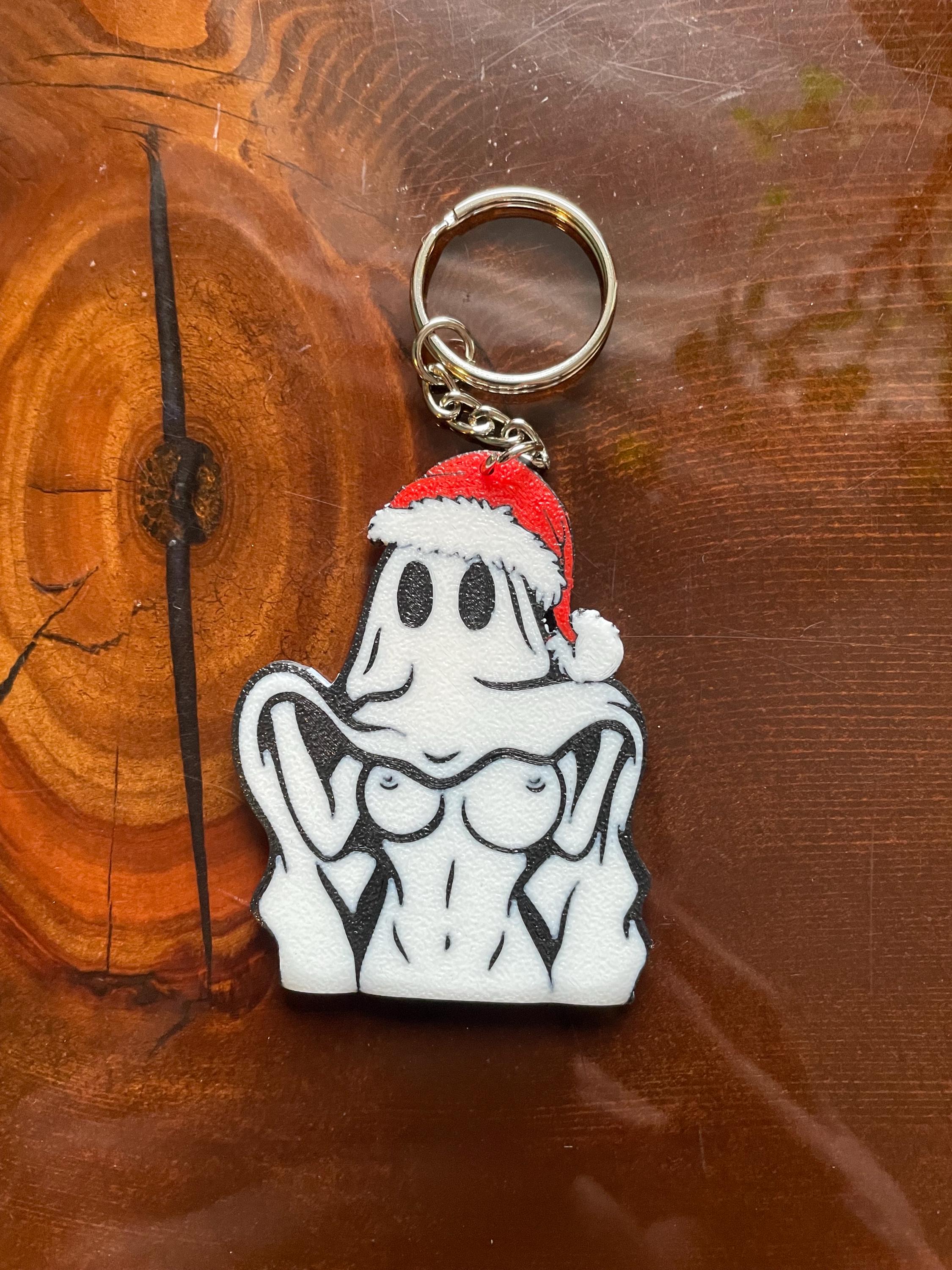 limited edition Christmas edition BOOObies Ghost Key chain -Textured on one side and smooth on the other -Measures 64mm x 50mm and is 2.5 mm thick, Very sturdy. -It may warp slightly in the extreme heat or too much moisture -Made in Canada Grahams Gems
